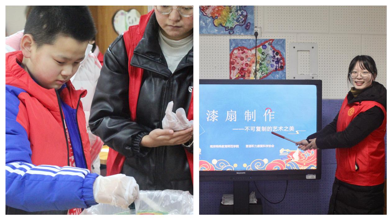 “漆扇制作”,参与人员在志愿者老师的教学下,大家选择好自己喜欢的颜色并制作处自己喜欢的漆扇,大家或互相帮助或跟随志愿者们的指导成功做出了自己喜欢的漆扇,同时也充分发挥了各自的创造能力与动手能力,这一活动大大提高了大家的兴致,将活动氛围提上一个高潮,在欢声笑语中收获爱的成果。