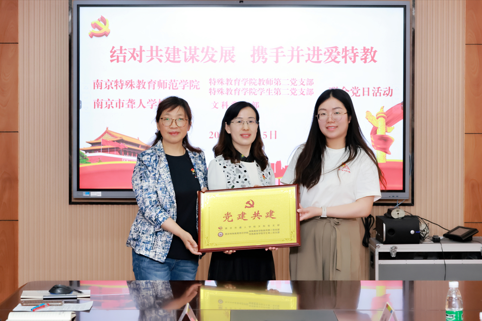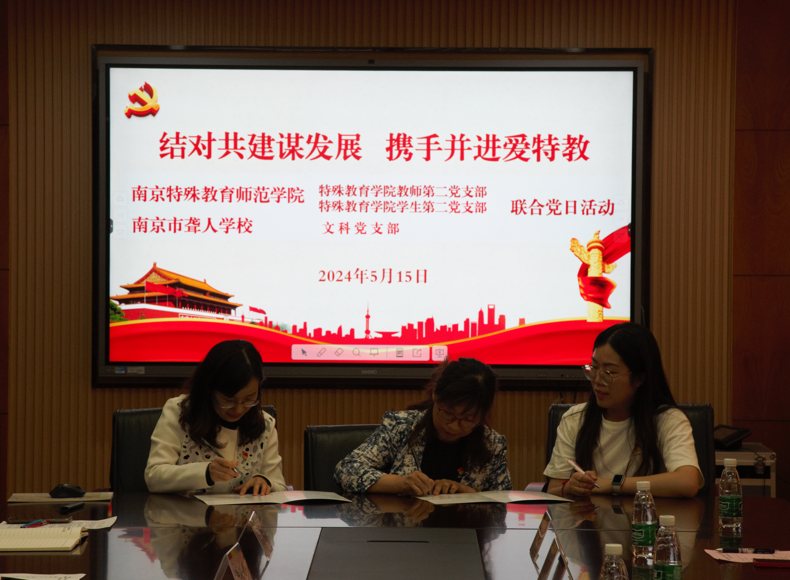 随后,公司师生党员们与南京市聋人公司党委陈源清书记、文科党支部的老师们齐聚会议室。首先由文科党支部陆盼盼书记和公司第二党支部副书记孙敏老师互相介绍到场嘉宾。接着由公司第二党支部书记史玉凤老师、员工第二党支部书记王赫煊老师与聋校文科党支部陆盼盼书记共同签约党建共建协议,并举行授牌仪式。