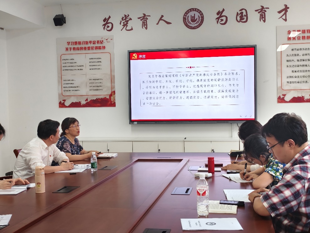 教师第二党支部书记史玉凤老师以“以案说纪:重塑高校教师师德师风”为题讲授纪律微党课。她首先结合文件学习,深入解读“学记、知纪、明纪、守纪”的具体要求,强调学党纪是基础、知党纪是关键、明党纪是核心、守党纪是根本。然后结合多起高校教师违规违纪案例进行剖析,警示党员教师要将党的纪律规矩刻印在心,内化为言行准则,高度重视自身师德师风建设。