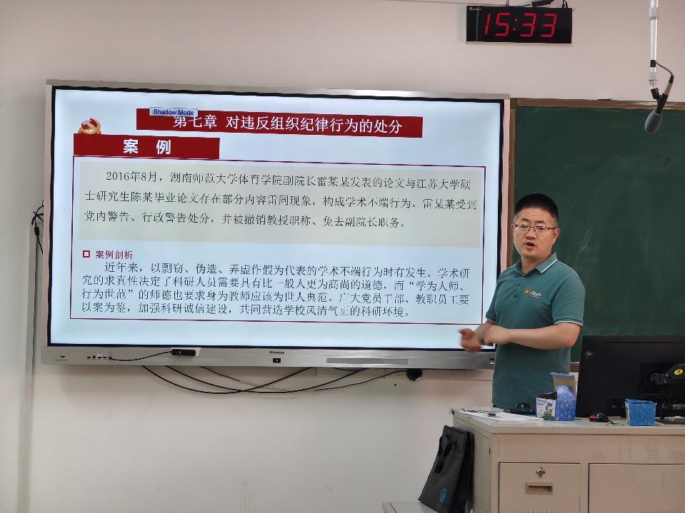 教师第一党支部书记琚四化老师以“以案说纪:加强师德师风建设”为题讲授纪律微党课。结合近年来高校发生的违纪案件进行深入剖析,提醒广大党员教师要以案为鉴,严守党规党纪,守住底线、远离红线,发扬以学促干的优良作风,为公司高质量发展作出更大贡献。