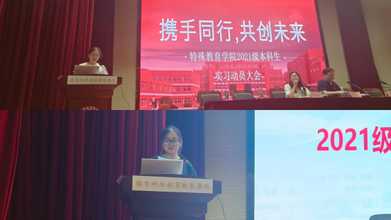 两位2021级员工代表上台发言,她们讲述了实习的意义和重要性,实习前的准备工作,表达了全体实习生对实习工作的期待和决心。她们表示将积极转变角色,适应新环境;虚心学习,不断提升自我;注重实践,在交流中成长;保持联系,及时反馈信息。