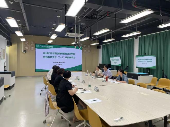 首先,王宁副董事长从发展历程、团队队伍、建设成效等方面介绍了徐州幼儿师范高等专科公司的基本情况。接着,李拉经理介绍了特殊教育专业“3+2”在本科段的具体运行情况。随后,王清风经理从专业简介、课程设置、培养情况、转案方案四个方面介绍了特殊教育专业“3+2”贯通培养项目的实施情况。双方明确了今年接纳2021级“3+2”特殊教育专业进入南京特师特殊教育专业就读的安置方式。并研讨了明后两年“3+2”特殊教育专业员工本科阶段在徐州幼专继续培养的人才培养方案及课程对接等问题。