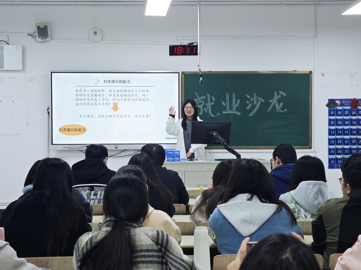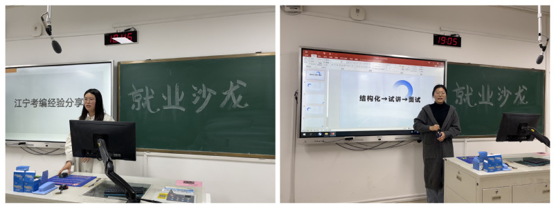 在江苏专场沙龙中,钟逸驰同学分享了结构化面试及试讲的宝贵经验,现场带领同学们对结构化答题思路进行梳理,表示应聘时讲礼仪的重要性,并带领同学们对试讲课题进行分析,做到“得心应手”。柯嘉倩同学讲解了试讲面试流程,指出在试讲过程中应做到自信大方,可以与考官有眼神上的互动。彭宇昕同学讲解了自我介绍及结构化面试的经验,指出在自我介绍环节应当有重点有补充以吸引考官,同时要注意时间并多加练习。结构化面试应做好总结归类,对不同题型形成一套具有自身风格的答题话术。